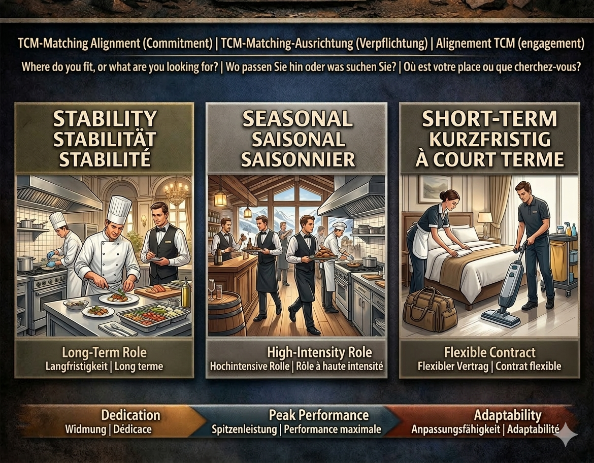 Your bridge to stable hospitality roles in Switzerland. We match you with positions based on your specific commitment—whether you are looking for a short-term seasonal sprint or a long-term career. We leverage our proprietary Three-Component Model (TCM) to ensure your placement aligns with your professional goals and personal needs.