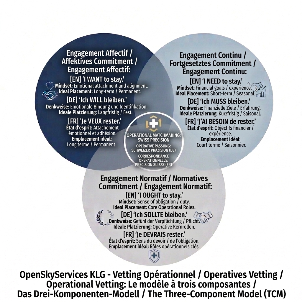 See Image: Using our Three-Component Model (TCM), we achieve precision placement by aligning a candidate’s psychological commitment (Affective, Continuance, or Normative) with your specific business timeline.
